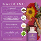 Ingredients: Lemon Balm Leaf Shatavari Root Chaste Tree Berry Ceylon Cinnamon Bark Pycnogenol (French Maritime Pine Bark) Vegetable Glycerin Purified Water Mandarin Juice Concentrate Sunflower Lechithin Yuzu Juice Powder Ginger Juice Powder